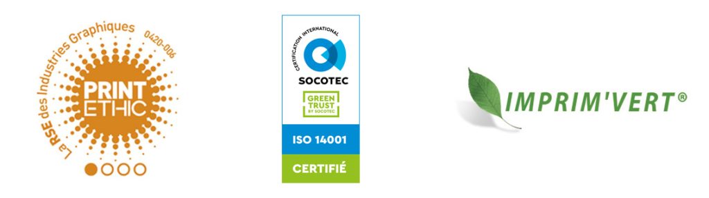 C’est une certification ISO 14001 obtenue en 2004 et remise pour la première fois en France à un imprimeur. Ce sont aussi des certifications PEFC et FSC® en 2009, le label Imprim’vert et le soutien à l’association Sylv’AACTES. C’est encore le label Print’Ethic obtenu en 2020.
